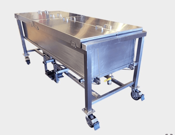 The Mobi Electric Immersion Table is manufactured by Mobimedical. It features 304 stainless-steel construction and is designed to contain cadavers in a solution for prolonged storage and study. The cadaver lies on an interior stainless-steel tray and can be lowered into the solution for extended storage. The Table height can be adjusted by using the foot pedals at the base of the Table.