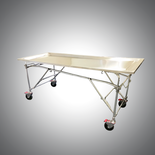 A handle release can easily adjust to either end of the table from 32.5″ to 38.5″ independently. The table is constructed with a 304 stainless steel, trough style top with strong lightweight tubular frame. The swivel wheels lock to keep the table stationary while in use. The drain, located in the center of the foot end, quickly eliminates fluid from the table. The legs fold compactly for ease of storage when not in use and can stand on one end for storage behind a door or in a closet.