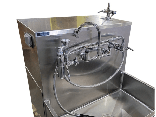 Eyewash station: Hand-held device with hose, flushes both eyes. Attaches to side of Embalming Station.